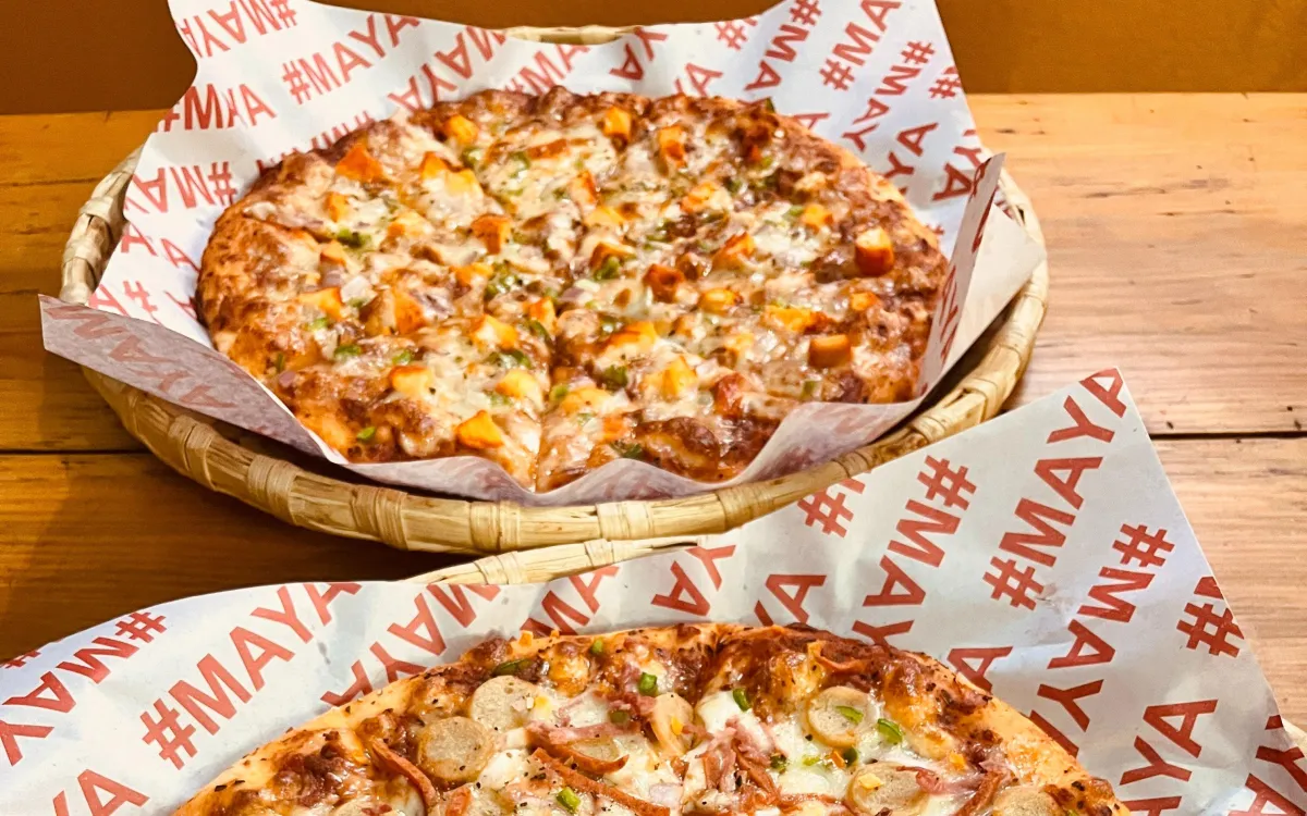 Met paprika, champignons, asperges, artisjokken, kaas en hete saus.