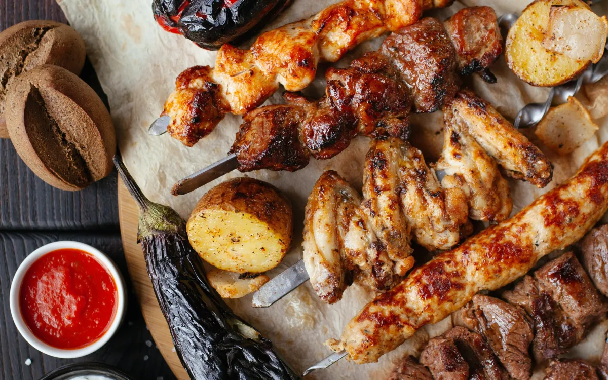 Gegrilde kipstukjes, lamsstukjes, Adana kebab kebab halabi en kebbéh spies.