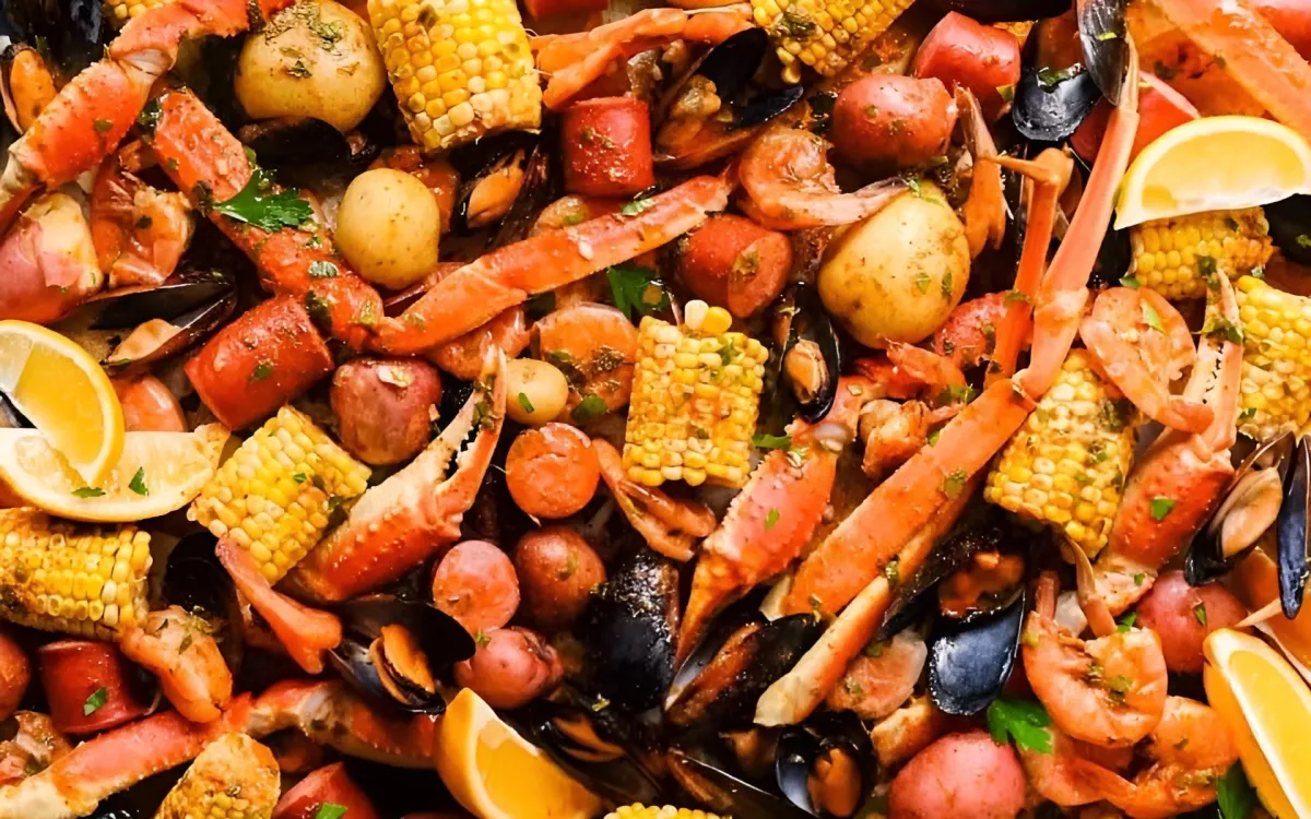 5 pcs shrimp, 5 pcs mussels, 5 pcs crawfish, 5 pcs clams, 5 pcs crab with corn and small potatoes. 5 stuks garnaal, 5 stuks mosselen, 5 stuks crawfish, 5 stuks clams, 5 stuks krab.