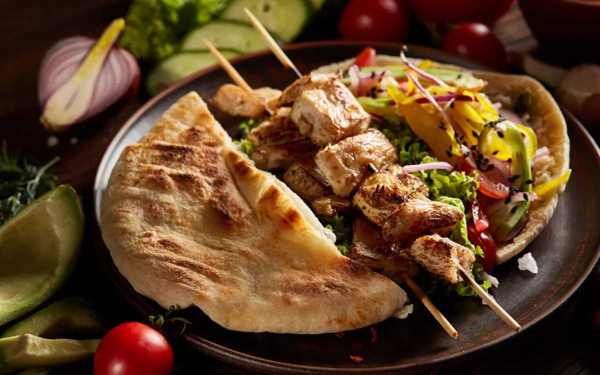 Suzuki, varkenshaas, ossenhaas, mousakas, gyros en tzatziki.
