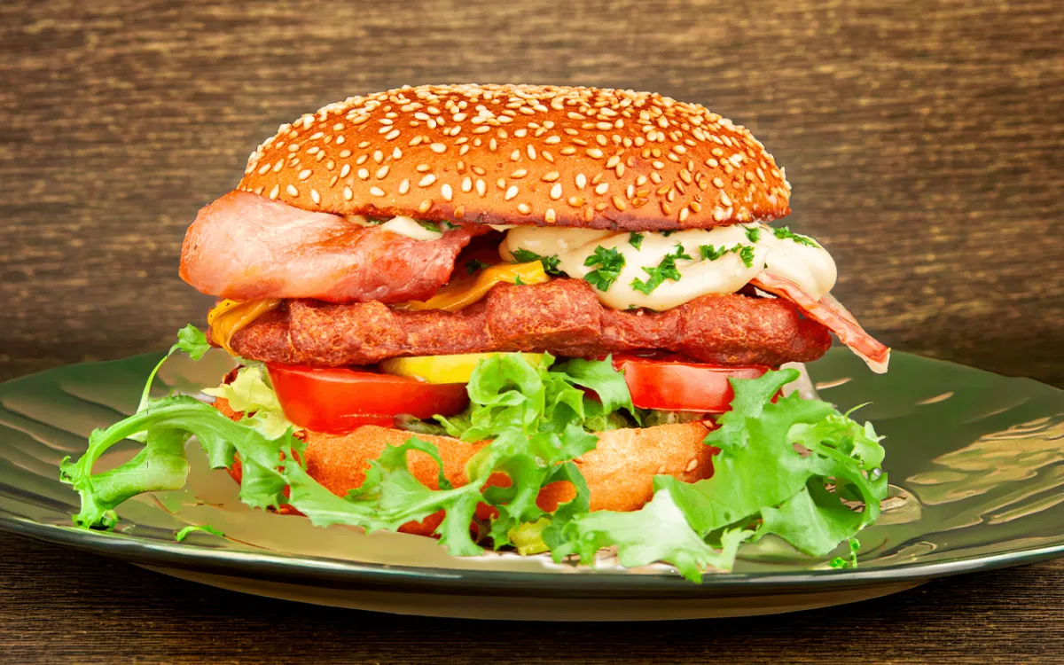 Dubbele burger met sla, augurk, tomaat, cheddar kaas, bacon en uienringen.