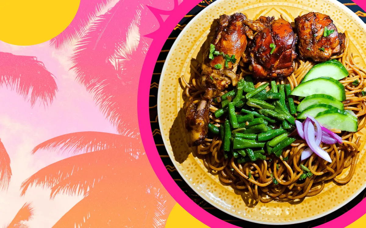 Javaans-Surinaamse bami met gemarineerde kip, kouseband, atjar en huisgemaakte sambal.