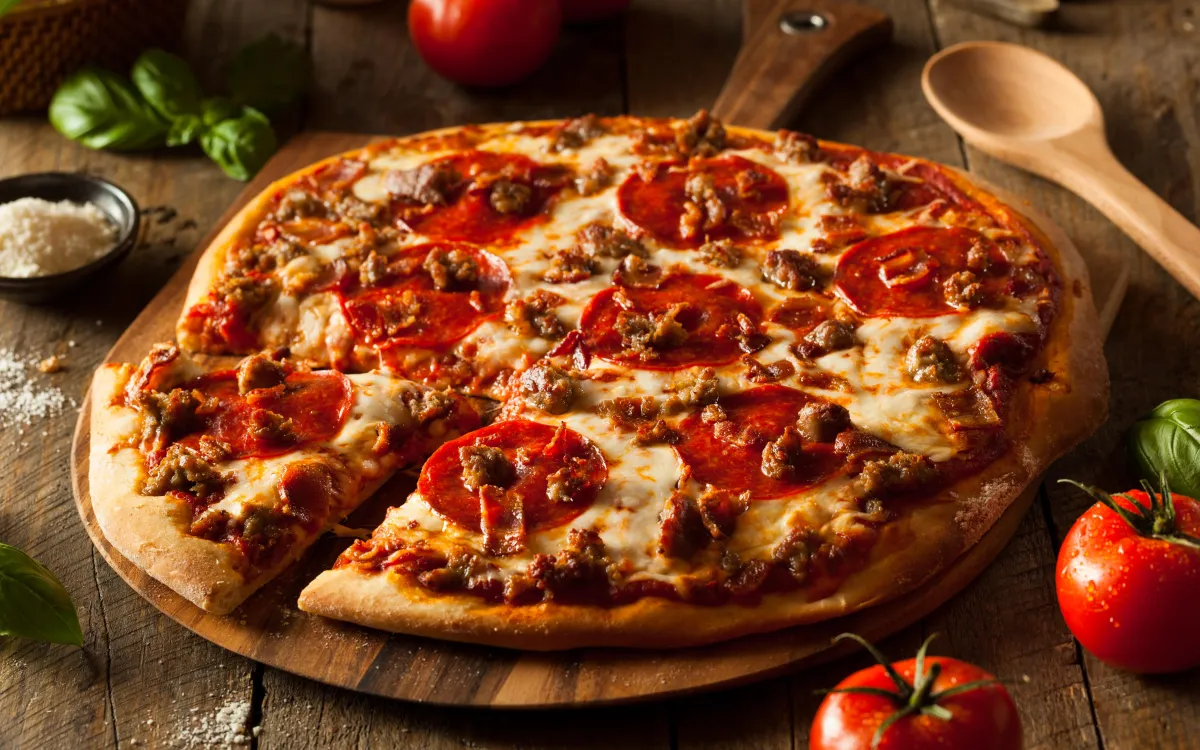 Pizza met tomaten, kaas, gehakt, champignons en uien.