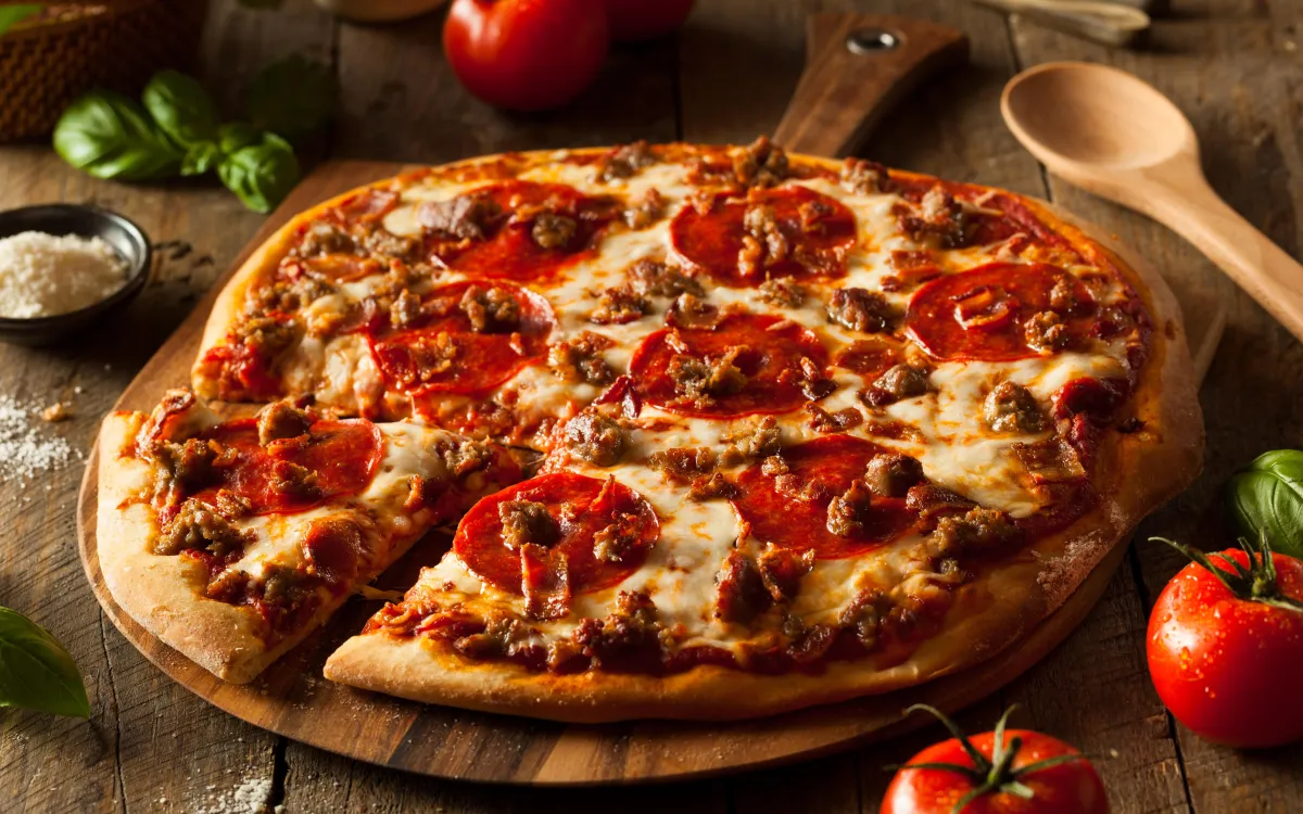 Tomatensaus, kaas, gyros, paprika, champignons en ui.