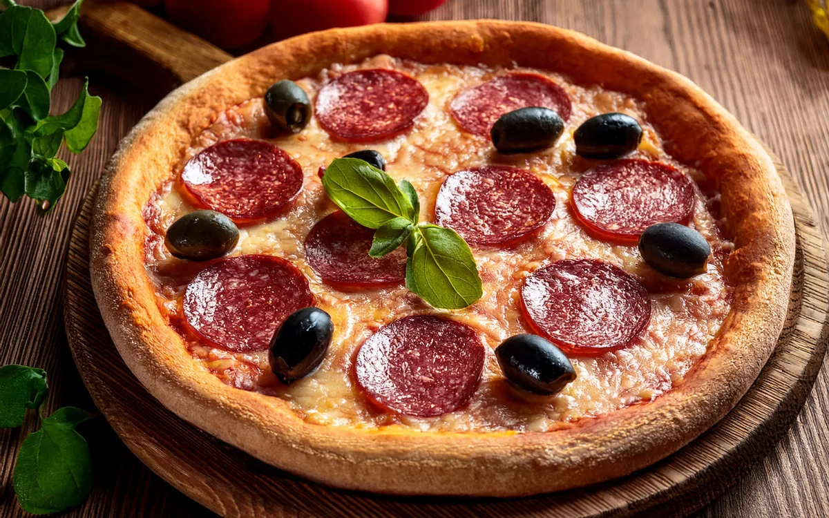 Tomatensaus, kaas, olijven, pepers, ham, salami en oregano.